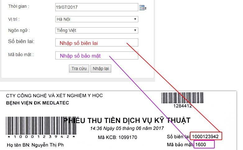 - Nhập mã bảo mật (là các số tự nhiên, nhảy ngẫu nhiên từ phần mềm khi in kết quả, được Bệnh viện cung cấp cho khách hàng qua Biên lai thu tiền)